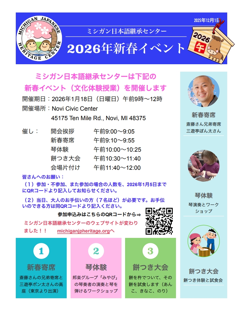 2026年新春イベント November 27, 2025 | No Comments | NEWS & EVENT 新春寄席・琴体験・餅つき大会を開催予定 開催期日:2026年1月18日(日):午前9時〜12時 開催場所:Novi Civic Center