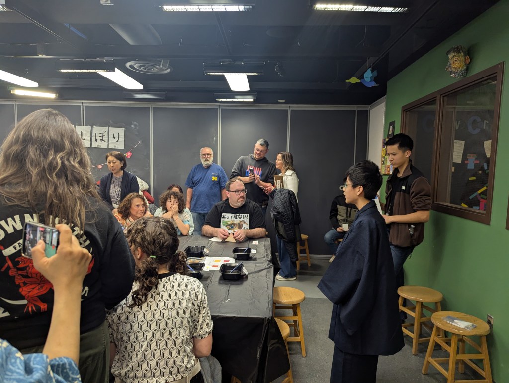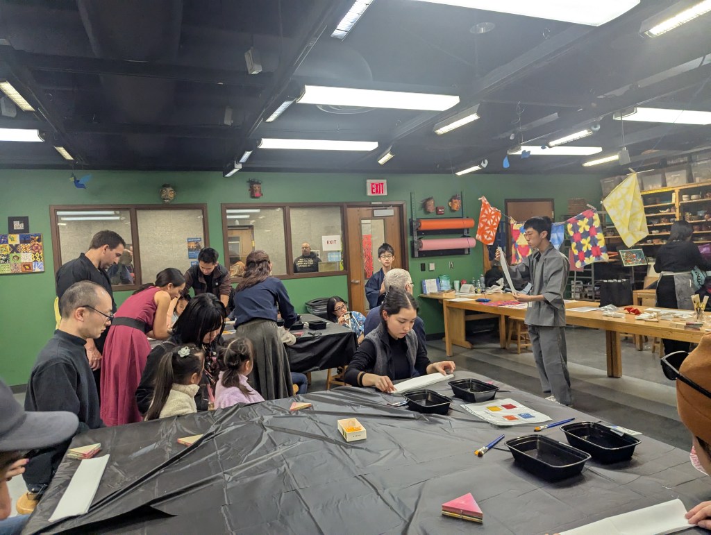 今回で雪花絞りを題材にしたワークショップは3回目ですので、生徒らも手慣れてはいたものの、当初参加者を2回の入替えで行うつもりが、参加希望者が多く3回の入れ替えで行いました。それでも入場をお断りするほど希望者が並んでくれました。生徒らも2時間いっぱい頑張ってワークショップを無事終えることが出来ました。今回の経験を日本語学習の意欲と自信につなげていってくれたらと願っています。また保護者の方々につきましては いつも快くお手伝いを引き受けてくださり、感謝しています。