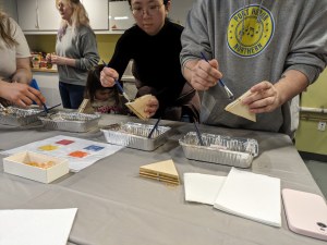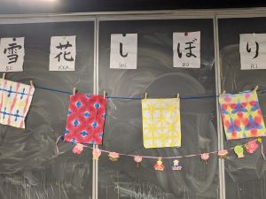 2025年3月に開催されたデトロイト美術館での「ひな祭り」と2025年9月のJBSD「日本祭り」に日本の伝統的な絞りである「雪花絞り」のワークショップを開催しました。白地の手ぬぐいを木枠でできた型(三角形や四角形)に挟み込みますが、まずこの型と同じ形に手ぬぐいを折っていかねばなりません。比較的簡単にやれる方もいれば、折り紙などに慣れていない方には生徒たちが手伝いました。ゴムバンドでしっかり型に挟み込んだ手ぬぐいを固定します。あとは4色の染料を好きなように筆で手ぬぐいに染み込ませていきます。この染料は太陽光で発色するため、室内で色を確認することが難しいのです。ワークショップで染色した手ぬぐいを自宅に持ち帰り、広げて光に当てるとどのような模様に出たか・・・皆さ「雪花絞り」でできた手ぬぐい作品を楽しんでもらえたと思います。